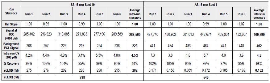 Figure 1. A calibration curve was generated using duplex siRNA, using capture probes specific to SS or AS strands, which were detected using an RNase protection assay on the N-PLEX platform (see schematic and protocol). Estimated lower limit of detection (eLLOD) for SS and AS in buffer and plasma are in Table 1.