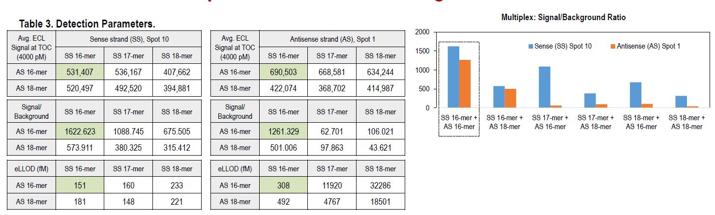 Figure 5. Shortened probes were multiplexed in combinations, in a single well, to simultaneously detect both siRNA strands. The SS 16-mer + AS 16-mer probe combination was chosen for further experiments based on detection criteria in Table 3 (highest signal-to-background ratio, lowest eLLOD).