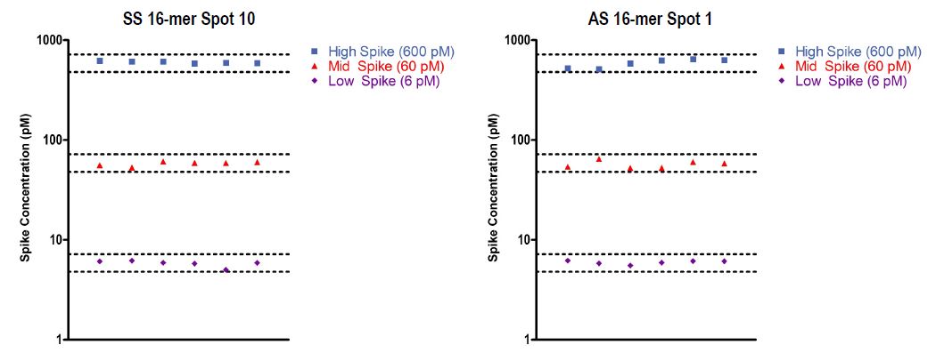 Figure 7. siRNA calibrator was spiked into mouse plasma at three concentrations. An SS 16-mer and AS 16-mer probe mix was used for multiplex detection of SS and AS. The percent recovery fell within acceptable guidelines of 100 ± 20%.