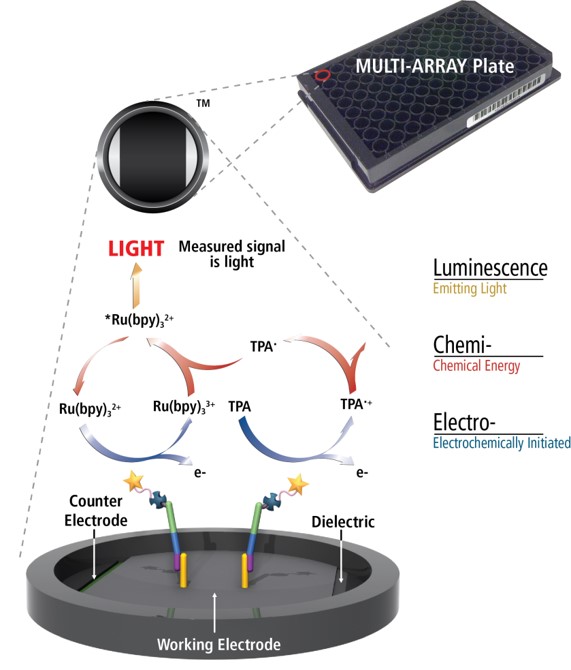 MSD’s electrochemiluminescence detection technology uses SULFO-TAG labels that emit light upon electrochemical stimulation initiated at the electrode surfaces of MULTI-ARRAY and MULTI-SPOT microplates.