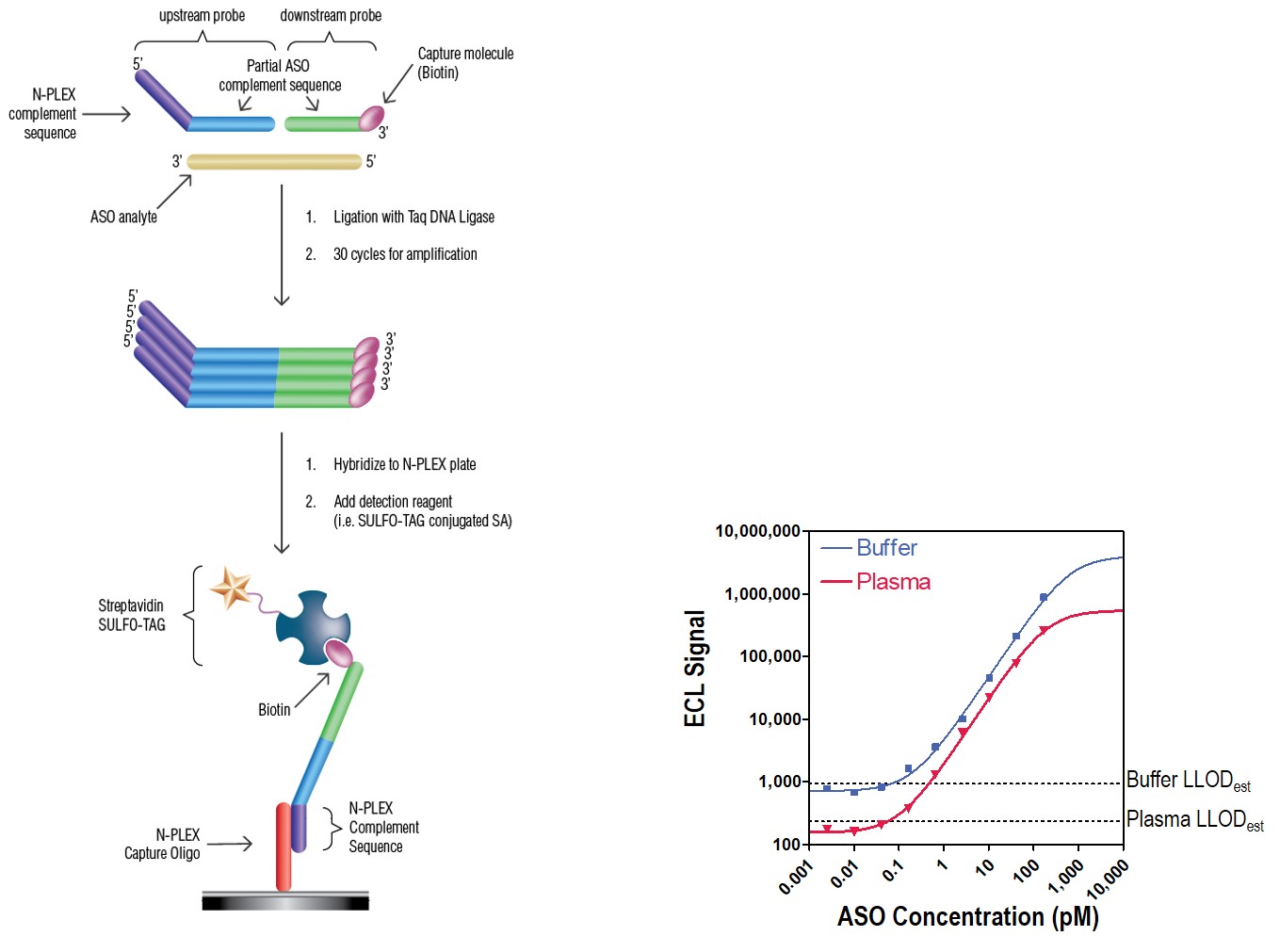 Figure 1. A calibration curve was generated using the ASO, and detection was completed via OLA paired with N-PLEX methodology (see schematic and method description above). Results for calibration curves and LLODest are shown with the ASO in buffer or plasma.