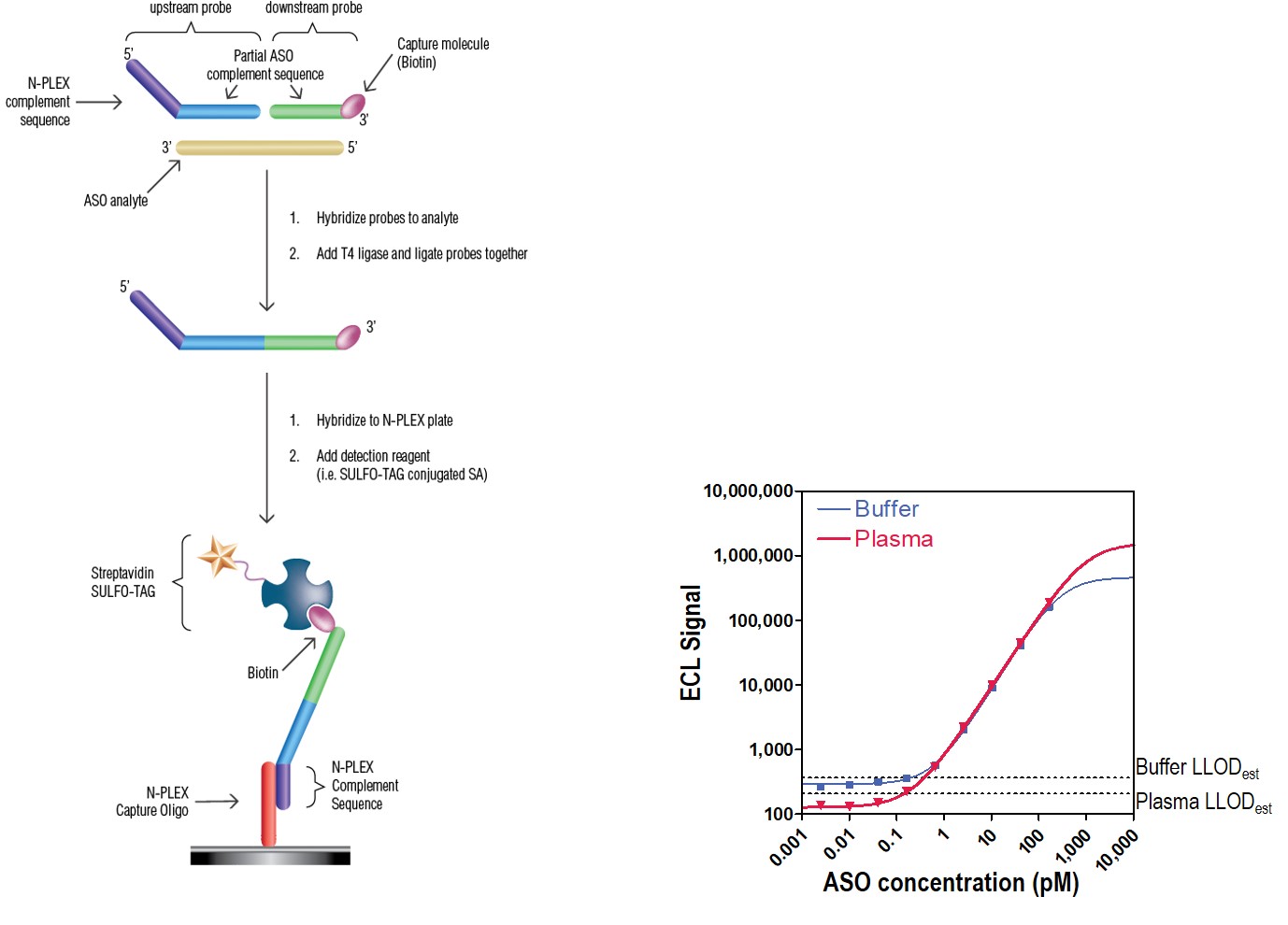 Figure 2. A calibration curve was generated using the ASO, and detection was completed via T4 ligase paired with N-PLEX methodology (see schematic and method description above). Results for calibration curves and LLODest are shown with the ASO in buffer or plasma.