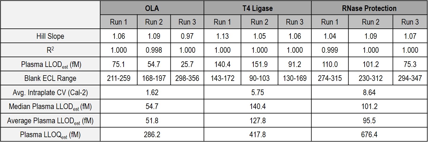 These data indicate that, paired with various techniques, the N-PLEX platform is a viable option for highly sensitive detection of ASOs in complex biological matrices. In fact, an average plasma LLODest of 51.8, 127.8, and 95.5 fM was achieved using OLA, T4 DNA ligation, and RNase protection assay, respectively. Factors to consider when designing assays for the detection of ASOs on the N-PLEX platform include the length and modifications of the specific ASO, type of biological matrix, assay time, and requirements for sensitivity and specificity.