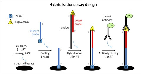 A dual-probe hybridization assay with an antibody-based detection method was developed using MSD’s platform to achieve high sensitivity. In brief, a biotin-labeled DNA probe, complementary to a portion of the analyte, was coated on the surface of a streptavidin plate. A digoxigenin (DIG)-labeled detection probe was hybridized to the analyte in the biological matrix using a thermal cycler or heat block. Samples were then added to the plate, where the analyte-detection probe complexes were bound by the coated capture probes. An anti-DIG antibody conjugated with an MSD GOLD SULFO-TAG label was used for signal generation (with the addition of read buffer) and the plate was read on an MSD instrument. The emitted light measured by the instrument is proportional to the amount of analyte present in the sample and provides a quantitative measure of the analyte in the sample. In addition to this standard assay format, an augmented reporter system was established (N-PLEX ULTRA) to further improve assay sensitivity through signal amplification.
