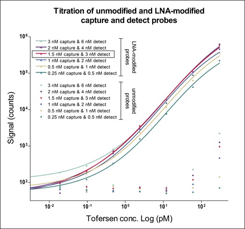 A probe titration experiment was designed to identify the optimal capture and detect probe concentrations for the assay. Increasing concentrations of unmodified or LNA-containing capture probes were coated on the assay plates. Unmodified probes generated very low signal levels. The use of LNA-containing probes significantly increased signal generation and assay sensitivity. When using 1.5 nM LNA for capture and 3 nM for detection probes, the assay was approaching its binding capacity. This condition was selected for further experiments.
