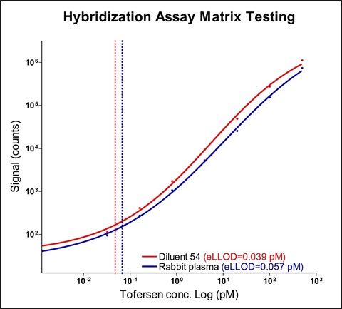 Following the selection of the ideal probe type and concentrations, we evaluated assay sensitivity in diluent versus rabbit plasma. The assay showed good linearity in both matrices. The estimated lower limit of detection (eLLOD) was 39 fM (0.2 pg/mL) in diluent and 57 fM (0.5 pg/mL) in rabbit plasma. By pre-binding the biotinylated capture probe to the plate we minimized free-biotin interference, which can be a concern in sample testing.