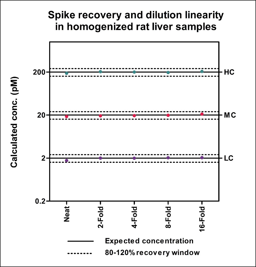 The analyte was spiked into rat liver lysate at 200 (high control, HC), 20 (mid control, MC) or 2 pM (low control, LC). Samples were then tested undiluted or after 2, 4, 8 or 16-fold dilutions in diluent. Quantification was performed using an eight-point calibration curve in plasma matrix. All sample recoveries were between 88 and 105% of the expected concentration and consistent linearity of dilution was observed over the tested range (0.125-200 pM).