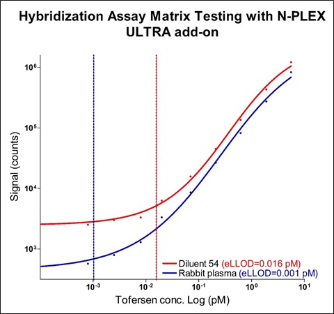 The feasibility of the proprietary N-PLEX ULTRA signal amplification method was evaluated in both diluent and rabbit plasma. This application requires two additional steps in the assay protocol that extend the assay time by 90 minutes. This assay format provides excellent results in complex matrices such as plasma. We achieved an approximately 50-fold increase in assay sensitivity in rabbit plasma compared to the non-amplified method and an eLLOD of 1 fM (7 fg/mL).