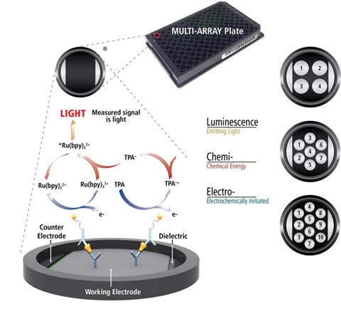 MSD’s electrochemiluminescence detection technology uses SULFO-TAG™ labels that emit light upon electrochemical stimulation initiated at the electrode surfaces of MULTI-ARRAY and MULTI-SPOT® microplates.