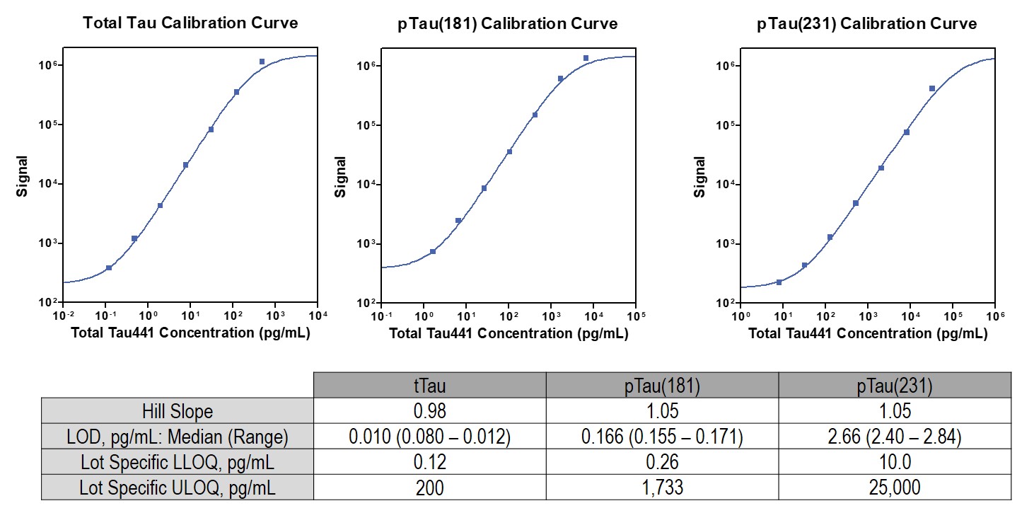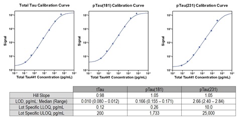Calibration curves for tTau, pTau(181) and pTau(231) are shown below, along with a table that includes Hill slopes, limits of detection (LOD), lower limits of quantitation (LLOQ) and upper limits of quantitation (ULOQ).