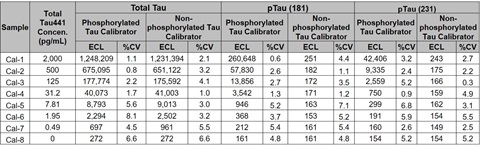 The detection limits for the pTau assays are 166 fg/ml for pTau(181) and 2,663 fg/ml for pTau(231). The assays are likely more sensitive given that the calibrator may not be 100% phosphorylated (further characterization of the calibrator is in process). Compared to pTau assays on the market, the S-PLEX pTau(181) assay is approximately 1000-fold more sensitive and the S-PLEX pTau(231) assay is approximately 35-fold more sensitive (after correcting for calibrator size/weight).