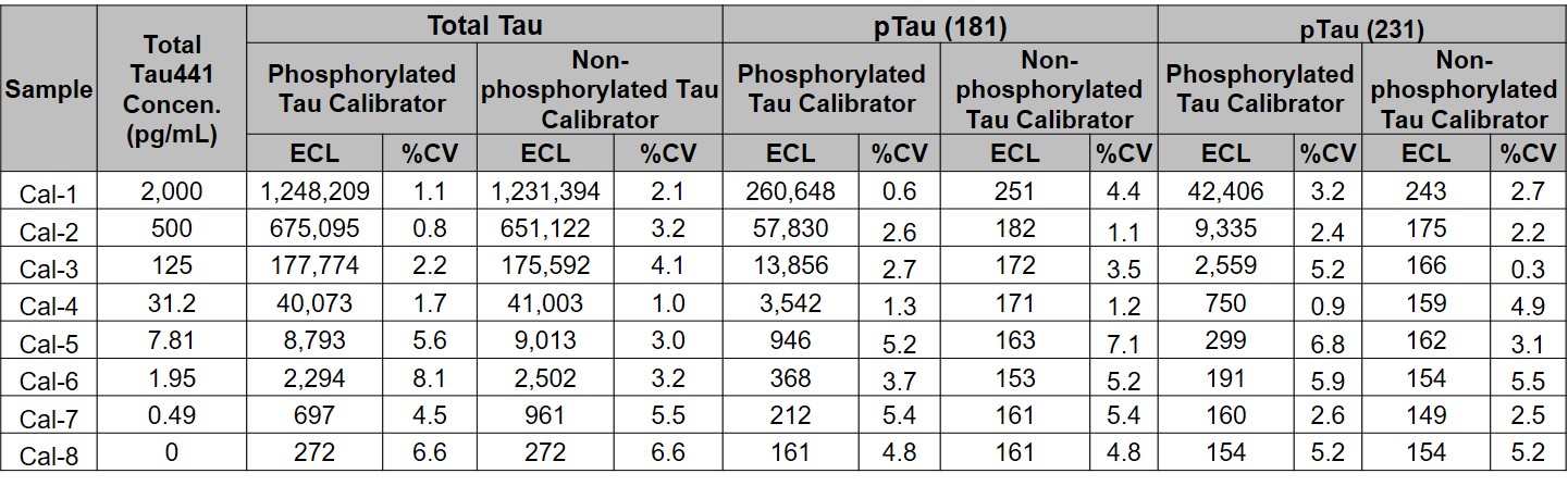 The calibrator is recombinant full-length Tau protein (Tau441); anti-Tau antibodies used in the assays recognize all 6 isoforms of Tau. A non-phosphorylated version of the calibrator was expressed in E. coli and used for the tTau assay, while a phosphorylated version was expressed in a mammalian system and used for the tTau assays. 100% phosphorylation was assumed for both the 181 and 231 sites for assigning calibrator concentrations (mass spectrometry indicated at least 60% phosphorylation at each site).