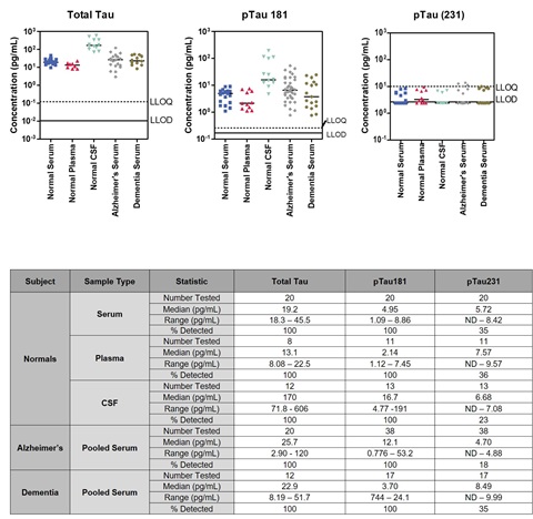 Results: The new MSD® S-PLEX tTau and pTau(181) assays have a limit of detection (LOD) below 200 fg/mL and below 3000 fg/ml for pTau(231) based on full length Tau concentration. All assays have a dynamic range of at least 3 logs. The assays were used to measure levels of the biomarkers in samples from normal individuals and individuals with AD. Levels of total Tau were detectible in all normal samples and were elevated in disease samples. Phosphorylated Tau was detectable in a subset of normal samples and was elevated in a number of the AD samples.