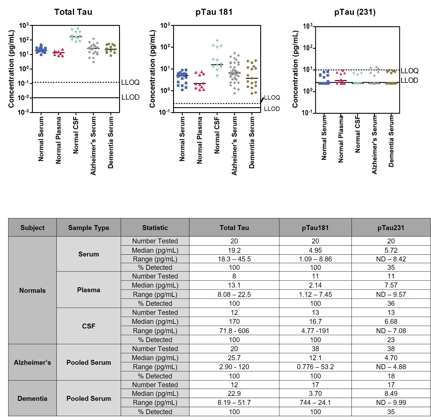 pTau(231) was below the LLOD in the majority of normal samples (undetectable samples are assigned the LLOD concentration in the graphs below).
