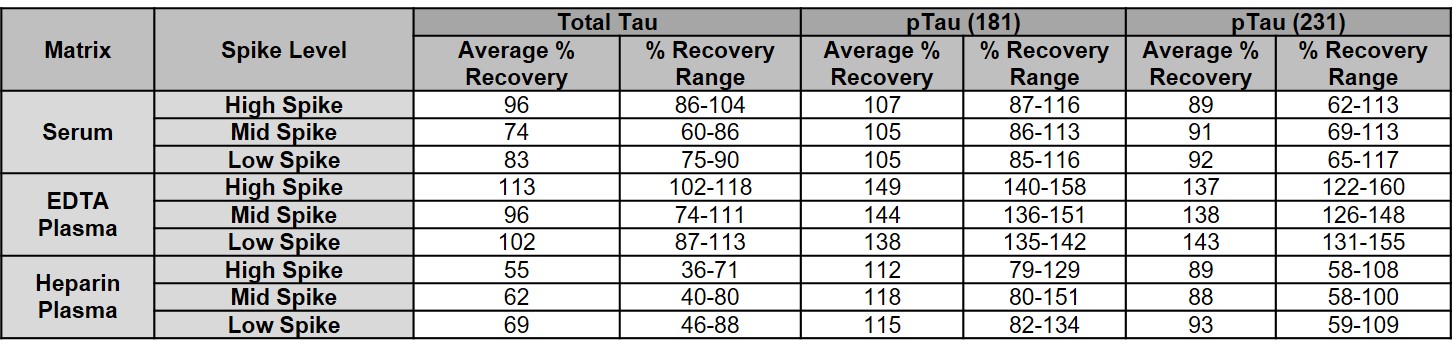 Average spike recovery for the tTau assay was within 70%-130% in serum and EDTA plasma.