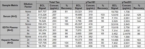 The pTau assays recovered within 70%-130% in serum and heparin plasma.