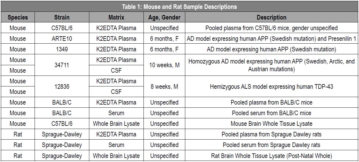 Plasma from four different mouse models of Alzheimer’s disease (AD) and one model of amyotrophic lateral sclerosis (ALS) were tested alongside C57BL/6 (control) commercially sourced mouse plasma at the recommended 2-fold dilution. Cerebrospinal fluid (CSF) samples matched from one model of AD and the model of ALS were tested at 100-fold dilution only due to limited sample availability. The biomarkers in all plasma samples were within the quantifiable range. The AD CSF samples were thresholded to assay limits of quantitation for GFAP and Tau, but detectable for NF-L. The ALS CSF samples showed elevated levels of all three analytes compared to levels in the AD model, though none showed significance due to high variability and the small number of samples that were tested. All plasma analytes trended higher in all ND models compared to normal mice, and measurements in the ALS model were further elevated above the AD model. AD plasma levels were significantly higher for GFAP and NF-L compared to controls.