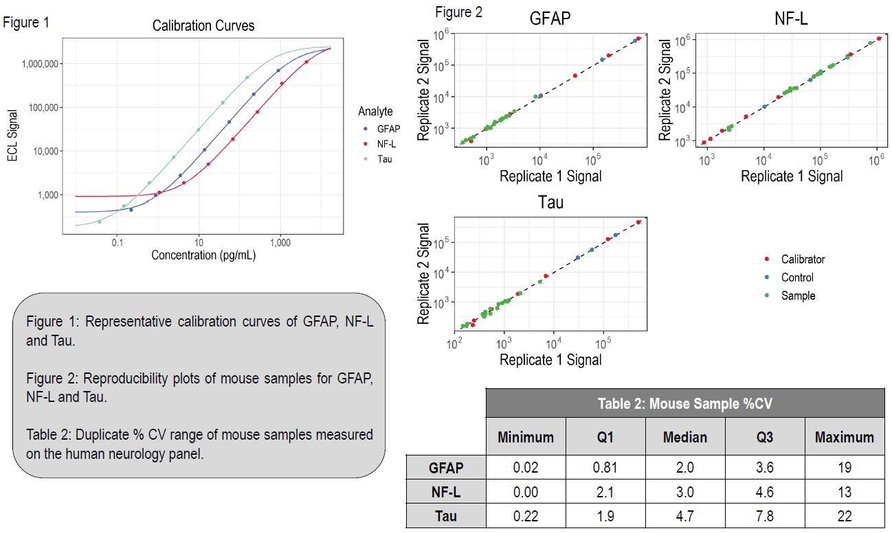 The MSD Human S-PLEX Neurology Panel 1 effectively cross-reacts with mouse and rat samples. GFAP and NF-L are fully detectable in mouse and rat serum, plasma, brain lysate, and CSF, and tau is detectable at a 2-fold dilution for serum and plasma and in 0.16 μg/mL of total brain lysate protein. Neurodegenerative mouse models display measurable increases in all analytes, varying based on the particular model. The humanized TDP-43 mouse model of ALS expresses particularly high levels of GFAP, NF-L and Tau compared to all tested AD mouse models. Levels in matched plasma and CSF samples from ND mouse models correlate well for all three analytes. These data demonstrate that the MSD Human S-PLEX Neurology Panel 1 can be used to quantify GFAP, NF-L, and Tau in various rodent models for research, model development, and biomarker development studies.