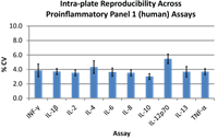 Data shown are for 35 lots of V-PLEX Proinflammatory Panel 1 (human) plates (Cat. No. K15049G). Intra-plate % CV and inter-plate % CV for all assays were observed to be less than 6% and less than 8%, respectively.